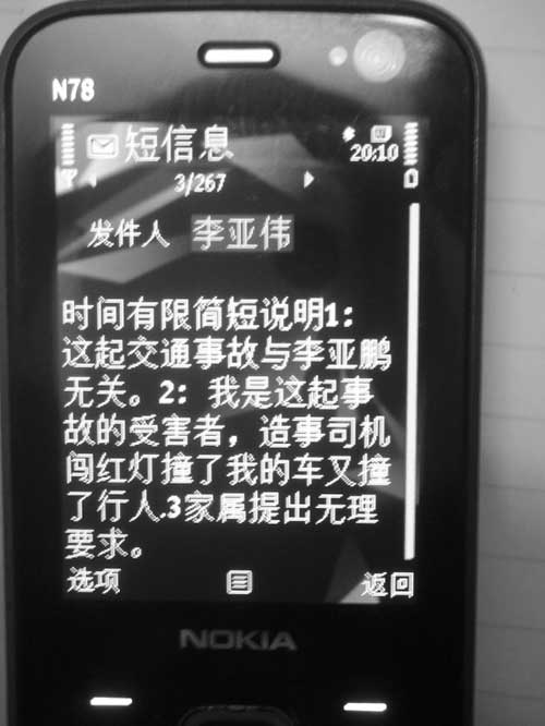 昨天,李亞偉接受了本報記者的采訪,針對“車禍門”事件,他給記者發來短信表明態度——1:這起交通事故與李亞鵬無關。2:我是這起事故的受害者,造事(應為肇事)司機闖紅燈撞了我的車又撞了行人。3:家屬提出無理要求。