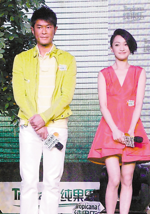 昨天在北京三里屯Village舉行的活動中,除了周、古兩人亮相外,正在成都籌備個唱的許巍也發來VIDEO,演唱了他為純果樂打造的主題曲《晨星》。為配合品牌的多彩顏色,古天樂和周迅分別以翠綠休閑裝和橙色短裙亮相,他倆一上臺就隔得遠遠的,在回答各自對對方的感覺時,古天樂很無厘頭地贊周迅“是個好人”,“她很年輕”,周迅則稱古仔“很幽默”。在主持人的帶領下,兩人回憶了各自的童年趣聞和從藝經歷,可惜兩位代言人卻始終沒有交流。