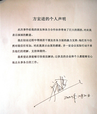 方宏進的聲明字數并不多,全文為打印字體,在文末空白處,方宏進簽上了自己的名字。一開頭,方宏進就道歉,“此次事件給我的親友和各方合作伙伴帶來了巨大的困擾,對此我表示深深的歉意。”飽受爭議的方宏進直言:“希望此事能夠盡快依法解決,讓涉及的企業和個人都能夠安心地從事各自的工作。”