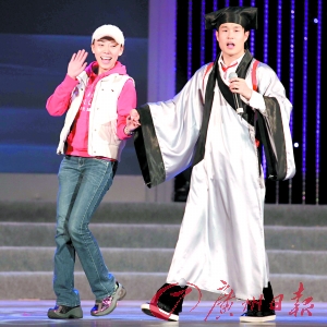 最讓人期待的小沈陽,雖然這次“爺們”了不少,沒再穿蘇格蘭格子裙,著一套黑色西服出場,但讓人驚喜的段子也就只有以水果比喻女人以及唱著粵語歌、背著喜羊羊書包扮寧采臣出場演《倩女幽魂》那一段,他和老婆沈春陽的調侃以及《大話西游》的小品依然是炒冷飯。不過,小沈陽一出場,觀眾的情緒就明顯高漲,還先后有兩位大膽女粉絲上臺送花獻吻,完全當同臺的沈春陽“透明”。