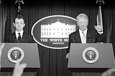 丹尼斯·奎德(右)與邁克·辛分別扮演克林頓與布萊爾。