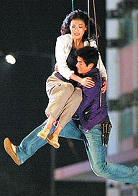 為了吊鋼絲的驚險(xiǎn)戲碼,電影公司貼心為城城、舒淇安排替身,但2人大部分仍敬業(yè)親自上陣,為求安全,拍攝前都戴上護(hù)具做好安全措施,并試戲2、3次才正式開(kāi)拍,過(guò)程大都安全順利。