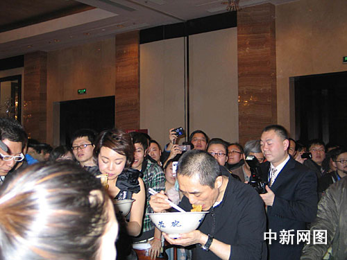 在《三槍》中,“高桌子低板凳都是木頭”的陜西話地道風趣,熱氣騰騰的油潑面更讓中國各地觀眾頓生興趣。很多觀眾看完 《三槍》,第一感覺就是想來一碗熱辣辣的油潑面。影片結尾,所有人復活,一起狂吃油潑面,場面壯觀。而今天,張藝謀、孫紅雷、閆妮、小沈陽、倪大紅等主創也當眾“秀”了一把陜西油潑面。如《三槍》中的歌詞所唱:“吃碗油潑面,我保準就能啪啪地沖鋒向前”。