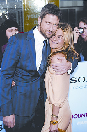 電影《賞金獵手》16日在紐約舉行首映式。主角詹妮弗·安妮斯頓與杰拉德·巴特勒相擁登場。兩人在拍片過程中多次傳出緋聞,首映現場兩人大方地拿緋聞開玩笑,還做出各種夸張的親熱動作,好似一對真戀人。