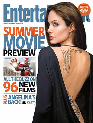 安吉麗娜-朱莉登上了最新一期的《娛樂周刊》雜志,封面上的她大秀美背,后背上的精致文身更添性感。34歲的朱莉接受了該雜志的采訪: