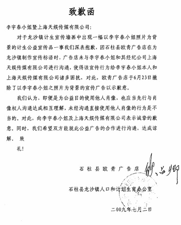 前不久有網(wǎng)友爆料李宇春的照片出現(xiàn)在了重慶市石柱縣龍沙鎮(zhèn)的計(jì)劃生育公益宣傳畫(huà)上,同時(shí)還打出“生男生女一樣好”的口號(hào)。天娛傳媒隨即指出此舉侵犯了李宇春的肖像權(quán)和名譽(yù)權(quán)。如今這張宣傳畫(huà)已經(jīng)被撤除,龍沙鎮(zhèn)人口和計(jì)劃生育辦公室還專(zhuān)程連同廣告公司一起向李宇春發(fā)出“致歉函”。