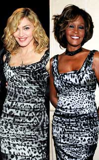 目前正在全球展開(kāi)巡回演唱會(huì)的麥當(dāng)娜,日前穿上一襲Dolce & Gabbana灰色豹紋小洋裝赴宴慶功,竟與惠特妮休斯頓在新專(zhuān)輯發(fā)表會(huì)上穿的洋裝是同一款式,兩大老牌歌后選在同日撞衫,相互較勁的意味濃厚。