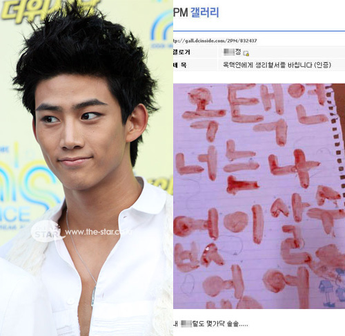 “朝鮮日報”消息,上月28日在社交網站DCInside的2PM圖庫中,一名會員上傳了寫有“玉澤演你沒有我就活不了”的血書。一些網民看到后懷疑“是不是用紅墨水寫的假血書?”對此,上傳這份血書的粉絲表示“我說到做到”,并公開了染血的內衣。