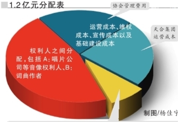 “我個人對這個分配比例沒有意見。”太合麥田老總宋柯表示,權利單位和音集協確定的這個收費模式,現在來看是比較合理的,一般同類協會的管理費在23%比較正常,而27%用于天合集團開展收費也還可以接受,“會上大家認為這錢花得還比較值”。