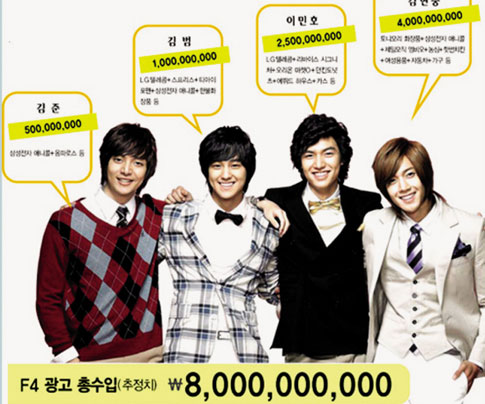李民浩、金賢重等《花樣男子》主演們也身價(jià)倍增,“韓版F4”的各種廣告收入加起來已經(jīng)超過了80億韓元。
