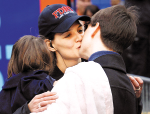 5個多小時后,凱蒂越過終點,與老公湯姆·克魯斯擁吻慶祝。