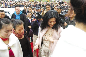 關之琳性感代言樓盤眾人圍觀 為防走光捂胸(圖)