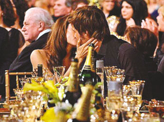2008年1月28日,洛杉磯,第14屆美國演員工會獎27日在洛杉磯舉行。一襲抹胸禮服的安吉麗娜·朱莉與布拉德·皮特大秀恩愛,幸福擁吻。