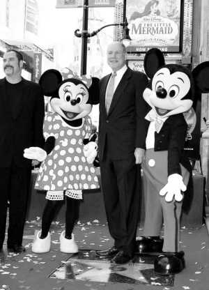 日前,迪斯尼前主席邁克爾·埃斯納留名好萊塢星光大道。在授星儀式上,迪斯尼的經典動畫人物米老鼠前來助陣,為典禮增添了不少活潑歡快的氣氛。