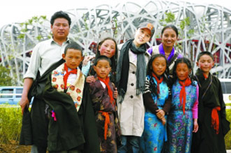 由國(guó)家廣電總局主辦的一場(chǎng)以?shī)W運(yùn)為主題的慈善晚會(huì)正在緊張地籌備之中,其中邀請(qǐng)了六位來(lái)自四川藏區(qū)希望小學(xué)的同學(xué)參加。范冰冰贊助了幾位藏族小朋友的往返機(jī)票并抽空陪同他們一起參觀奧運(yùn)場(chǎng)館。圖為范冰冰帶領(lǐng)大家參觀奧運(yùn)會(huì)的主場(chǎng)館“鳥巢”。記者 楊林