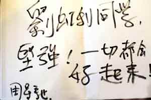 四川地震之后,不少幸存同胞心靈遭受了巨大的創傷,25日,記者帶著周星馳、邰正宵、張萌等明星的親筆書信來到了劉虹利的病房。當周星馳、邰正宵等明星的親筆信交到虹利手中時,她露出了多日來難得的笑容,嘴里反復說著:“真沒想到明星會給我寫信。”而周星馳正是她喜歡的電影演員之一。 胡 蓉