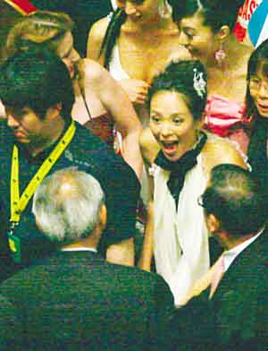 此后章子怡又看到兩位熟悉的外籍電影人,馬上張大嘴表情夸張地與對方“溝通”,并再度用章式貼面禮給對方一個問候。 (劉嵩)