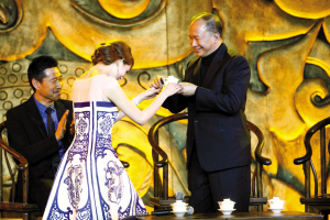 由于影片中出現眾多“雷人”的臺詞,外界對于《赤壁(下)》的期待,已經從一部歷史片演變成一部賀歲喜劇片。不知道是不是受此影響,前晚剛在北京看過《赤壁(下)》的主創們,在昨日的首映發布會上也都充滿了“喜劇感”。穿一襲青花修身裙子亮相的林志玲特意在現場大秀茶藝,為各位赤壁將領沏上功夫茶,并親手送到導演與諸位男演員手里,讓一眾男士感覺十分受用。而成龍大哥也前來捧場,一上臺便給好友吳宇森一個熊抱,整個場面其樂融融。
