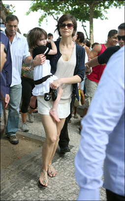 正在巴西度假的凱蒂·赫爾姆斯昨日(2月2日)帶著自己可愛(ài)的小女兒在巴西的海灘上悠閑的走著,白色的短褲襯得美腿秀場(chǎng),藍(lán)色的外衣輕巧的抵擋這紫外線的困擾,半臉墨鏡體現(xiàn)非凡氣質(zhì),一雙阿瑟丁·阿拉亞涼鞋提升品味,活脫脫一個(gè)高大版的芭比娃娃。而懷中抱著的孩子簡(jiǎn)直就是天使降臨,粉嫩的皮膚,配上白色的小裙子,可愛(ài)至極。