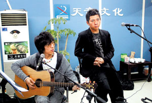 羽·泉在北京一家錄影棚中現身,二人正在為這周六舉行的“黃金10年”演唱會進行排練。