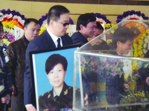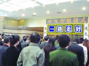 昨天的追悼會現(xiàn)場不但來了很多葉凡生前的好友,也來了不少葉凡生前的戰(zhàn)友,據(jù)武警文工團(tuán)政委尚力峰介紹,“當(dāng)聽說葉凡去世的消息后,所有和她合作過的戰(zhàn)友都驚呆了,我們都不知道她的病情居然那么嚴(yán)重,她沒告訴我們,是不想讓我們操心啊!因?yàn)槲渚墓F(tuán)即將要有幾個大型的演出,所以戰(zhàn)友們不能全來,但他們送上了花圈表示哀悼。葉凡在我們團(tuán)是出類拔萃的臺柱子,大型晚會不能少了她,她平時對自己要求十分嚴(yán)格,對于創(chuàng)作也是一絲不茍。有一次某地發(fā)生洪澇災(zāi)害,葉凡主動請求到一線演出慰問,并創(chuàng)作《真情永遠(yuǎn)》。2003年非典時期,葉凡已經(jīng)得病,但她沒有說任何理由,再次主動要求參加創(chuàng)作,并寫出《天使的故事》,讓全團(tuán)都為之感動。她也多次獲得過文化部一等獎,可以說現(xiàn)在正是葉凡最輝煌的時期,可她卻離我們而去,太可惜了!”