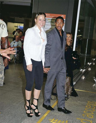 瑪麗亞·凱莉與丈夫步出機場。圖片均來自香港《明報》