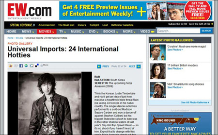據(jù)體育朝鮮報道,《娛樂周刊》舉出Rain最性感的代表作品為今年即將上映的影片《忍者殺手》。并介紹說,他被譽(yù)為韓國的“賈斯汀-汀布萊克”,歌聲、舞蹈、演技樣樣出色,他還在紐約麥迪遜廣場花園劇院舉行演唱會、參加電視綜藝節(jié)目《科爾伯特報告》等,在美國表現(xiàn)得也十分活躍。