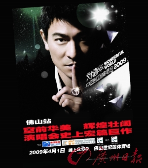 他成就了一種精神——永不言敗,他鑄就了一個(gè)榜樣——奮斗不息,他就是華人演藝圈的“勞模”——?jiǎng)⒌氯A。在2009本命年,劉德華將把 “Wonderful World(奇幻世界)”巡回演唱會(huì)帶到中國(guó)內(nèi)地,馬不停蹄地與各地樂迷分享他出道以來最豪華的演唱會(huì)。而值得廣東樂迷開心的是,劉天王將于3月20日和4月1日分別登陸廣州奧林匹克中心和佛山世紀(jì)蓮體育場(chǎng),兩場(chǎng)演唱會(huì)都可容納3萬多樂迷。