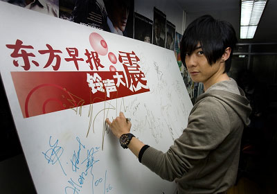 由于活動推遲了20分鐘,唐禹哲還未坐定,電話便響個不停,而唐禹哲來不及喝口水潤喉便認真地與FANS聊起來。聽說這位打進電話的FANS,正是在前日簽售會上為自己送禮物的人,唐禹哲連連道謝,“我看到大家托你送的很大一包東西了,我很喜歡,我會帶回臺灣去的。”聽出FANS對他的話持著半信半疑的態度,唐禹哲又反復強調,“我有拆開來看過,是玉和胸章對吧!”讓對方受寵若驚忍不住尖叫。
