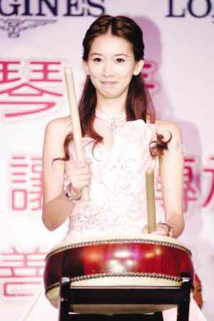 圖文:林志玲著粉嫩絲裙 敲大鼓賣表助弱勢兒童