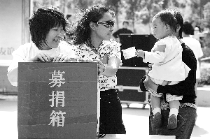 5月18日下午,國美第一城的部分居民在社區廣場上表演唱歌、朗讀等節目,以吸引眾人前來捐款,當天獲捐數額達到了1萬多元。本報記者 王嘉寧 攝