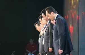 昨晚8時,晚會準點拉開序幕,在主持人白巖松的帶領下,現場所有人全體起立,集體默哀一分鐘,為此次地震災難中喪生的同胞表示哀悼。無論觀眾還是演員,現場的每個人胸前都貼有一個紅色的心,上書“愛的奉獻”,將晚會主題烘托得淋漓盡致。