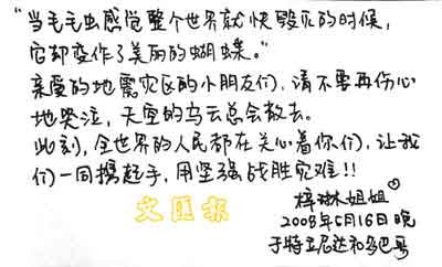 中新網(wǎng)5月21日電 四川發(fā)生巨變,現(xiàn)正以世界小姐身份到全球各地訪問的張梓琳,發(fā)布一份由她親筆寫下的鼓勵災(zāi)區(qū)小朋友的信件,并急切希望能早日回國參與及幫助災(zāi)區(qū)的活動。
