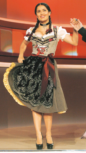 墨西哥性感女星薩爾瑪·海耶克近日盛傳與法國名牌大亨皮諾前日登上德國電視節目《Wettendass...?》,并穿上當地傳統服飾大跳土風舞,低胸的上衣令其36C上圍呼之欲出,連同場的名牌Chanel設計師“老佛爺”卡爾·拉格菲爾德也看得目不轉睛。
