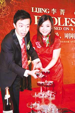 昨早10時,郭德綱、于謙、小何、春妮等應邀前來。郭德綱和于謙默契地以“白T恤蹭花了”的服裝出現,頗為喜氣。他更在留言板上題詞“真是太刺激了!!”當天婚宴的主持由郭德綱擔當,他表示自己很少主持此類婚宴,但臺上與新郎李菁一唱一和的搭檔風趣幽默,令在場所有嘉賓開懷不已。他更形容新娘“五大三粗”語含深意,據知情人透露,新娘極有可能已經懷孕。