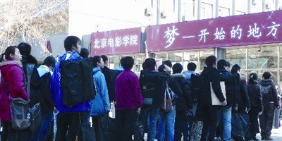 在影視界,“中戲”、“上戲”、“北電”呈三足鼎立之勢,其地位無人可以撼動,人稱“明星搖籃”。近年來這三所學校藝術考試持續升溫,報考人數屢創新高。在北電,表演專業一直被認為是最難考的專業,雖然今年的招生人數由往年的30人增加到75人,報名人數卻高達4234人,淘汰率為98.2%。即便知道面臨著如此殘酷的競爭,可那些懷揣著明星夢想的俊男靚女們,仍不遠萬里,從五湖四海為了一個共同的目標走到了一起,懷著明星夢擠上這座獨木橋。