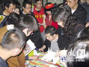 位于五臺山的先鋒書店本來是一個(gè)很幽靜的地方,因?yàn)閷?dǎo)演賈樟柯的到來,幽靜被打破。昨天上午,原定于11點(diǎn)舉行的簽售活動,沒等賈導(dǎo)落座就被數(shù)百名大學(xué)生圍得水泄不通。書店準(zhǔn)備了300多本《中國工人訪談錄》,150多本《賈想》,還有100多本《一個(gè)人的電影》。記者透過人群,看見賈導(dǎo)極其認(rèn)真,他不只是為讀者簽上自己的名字,而是先把讀者的名字寫在前面,他的助理說賈樟柯三個(gè)字筆劃多,肯定不如于丹簽得快。接近中午12點(diǎn),等著簽名的隊(duì)伍還沒有散去,600本書不夠簽的。