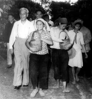 畫面上,曾六妹(前方穿花格衣服者)和她的同學(xué)張桂嬌提著滿藍(lán)的咖啡果走在前面,兩人還不時交流勞動心得,而劉少奇則像一位和藹的長者,慈祥地跟在她們身后。