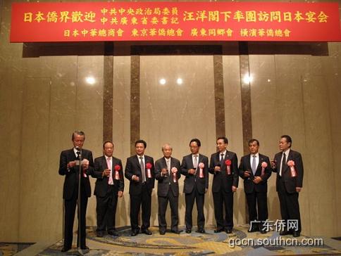 中新網11月6日電 據廣東僑網消息,11月4日晚上,為歡迎中共中央政治局委員、廣東省委書記汪洋率團訪問日本,日本中華總商會、東京華僑總會、日本廣東同鄉會、橫濱華僑總會在東京最著名的赤坂格蘭王子大酒店五色大廳聯合舉行歡迎宴會。這也是日本新、老僑團歷史上首次聯合舉辦活動歡迎國內的代表團。