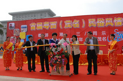 中新網2月24日電 據茂名外僑局消息,2月23日,廣東省茂名市在市文化廣場隆重舉行首屆粵西(茂名)民俗風情旅游節,同時啟動“春游粵港·三八同樂”和“廣東2010年華人華僑旅游年·相約茂名”活動。茂名市人大常委會常務副主任宋壽金,廣東省僑辦副主任林琳,廣東省旅游局副局長王志紅,茂名市市委常委、副市長林日娣,市政協副主席章寧,茂名市外事僑務局局長梁紅健及美國茂名同鄉會會長郭嚴芳先生等領導和各界來賓約600人出席了活動。