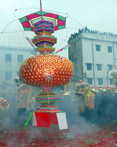 “泮村燈會”始于明朝英宗天頤八年(公元1464年,農歷甲申年)正月十三日,至今500多年。每年農歷正月十三,開平市水口鎮泮村舉行舞燈盛會,今年當地迎來了第十一屆舞燈盛會。當天上午,3個三米多高的大花燈,以羅傘彩旗開路,龍獅共舞,鞭炮齊鳴,巡游于泮村48條自然村,全過程包括扎燈、送燈、起燈、舞燈、打燈,故擇其名為“泮村燈會”。