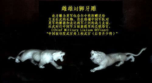 據悉,此次捐贈儀式交接的一對印度象牙精雕的雌雄獅子,是1943年由英軍元帥蒙巴頓的辦公室主任鮑威爾中將贈送給杜武將軍的私人禮物,意在感謝中國遠征軍于1942年4月在緬甸仁安羌解救7000名被日軍包圍幾乎彈盡糧絕的英緬軍官兵和500名西方國家的記者、教師和傳教士。這對牙雕曾輾轉于印度,重慶,南京,渥太華,卡爾加里。歷經68年的蹉跎歲月,如今由侵華日軍南京大屠殺遇難同胞紀念館收藏并展出。這對牙雕是中國抗戰史上非常稀有的歷史文物,是中國遠征軍英勇作戰,解救英軍的歷史佐證,具有較高的歷史價值。(許嘉明)