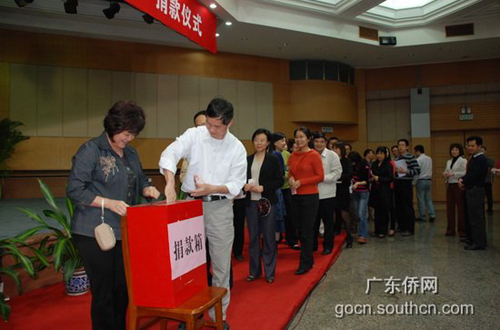 中新網4月26日電 據廣東僑網消息,4月26日,廣東省僑辦在機關二樓禮堂舉行“送溫暖,獻愛心” 捐款儀式,廣東省僑辦主任吳銳成率班子成員及全體干部職工參加捐款活動并帶頭捐款,機關干部職工及直屬單位共向災區捐款40萬元。