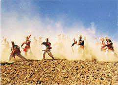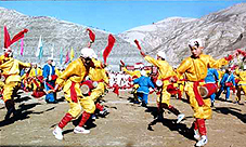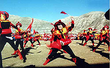 安塞位于陜北高原,那里的腰鼓歷史悠久,格調古樸。人們在歡度節日,慶祝豐收的時候,都要演出腰鼓助興,每次演出的陣容都很大,一般都有60名左右的鼓手。有時幾個隊連在一起,能拉開一兩里路距離。腰鼓手們的裝束一律著古代將士的便服,或黃或紅包頭,素色衣服,顯得整齊壯觀。電影《黃土地》里的腰鼓手們穿著黑色,想必是為了渲染貧苦背景。實際上,過去上場表演的腰鼓手們,很少有穿皂服的。